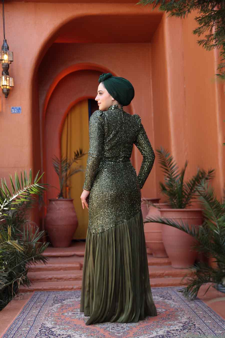 Ürün Özelliği:Dik yaka, uzun kollu, omuzları büzgülü, payet boncuk işlemeli, etek ucu çapraz volanlı, astarlı, kendi kumaşından kemerli ve arka ortadan fermuarlıdır.