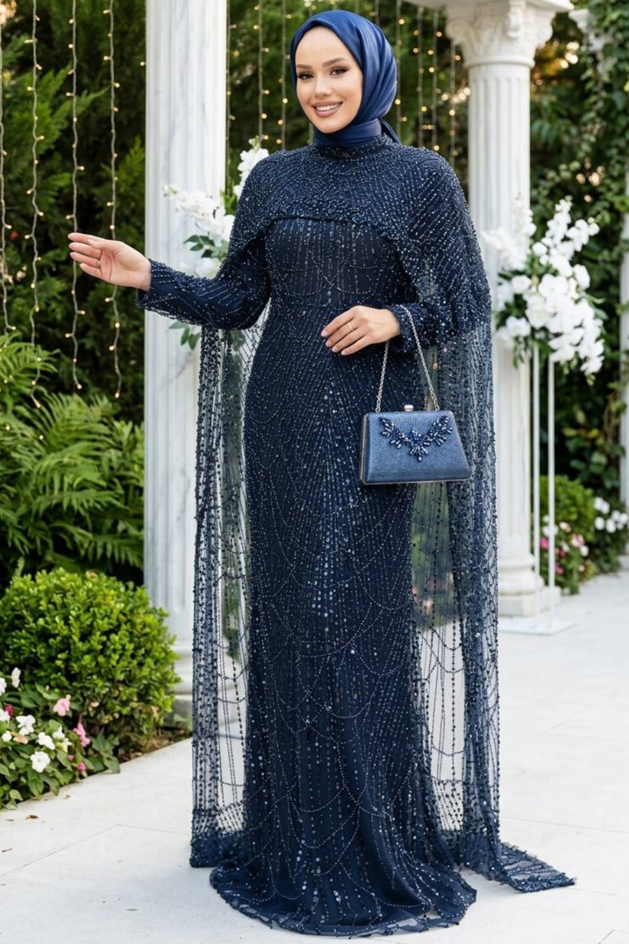 Ürün Özelliği:Dik yaka, uzun kollu, pelerinli, boncuk işlemeli, arka ortadan fermuarlı ve astarlıdır.
