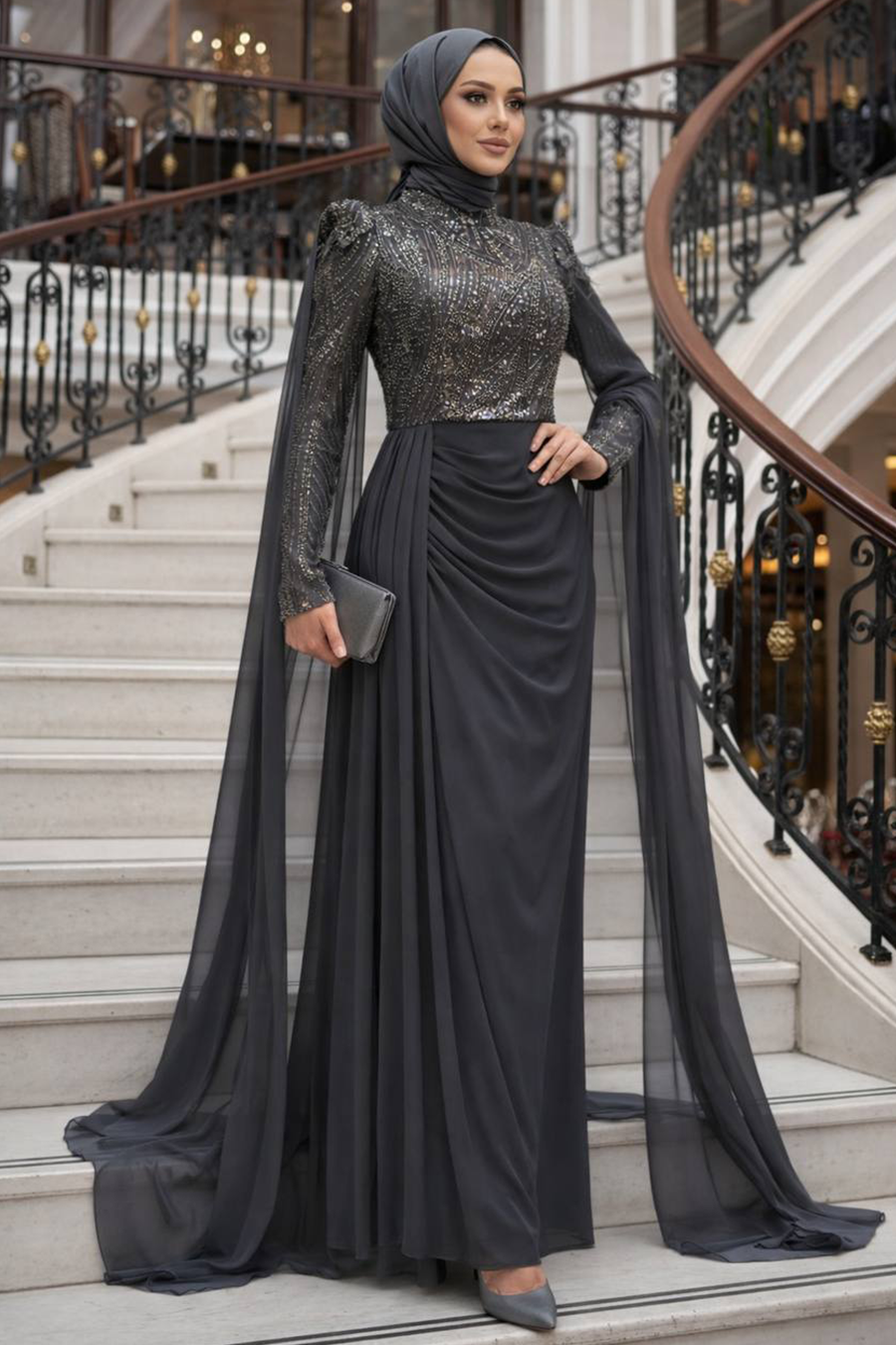 Ürün Özelliği:Dik yaka, uzun kollu, omuzları tüylü, pelerinli, boncuk işlemeli, drape detaylı, astarlı ve arka ortadan fermuarlıdır..