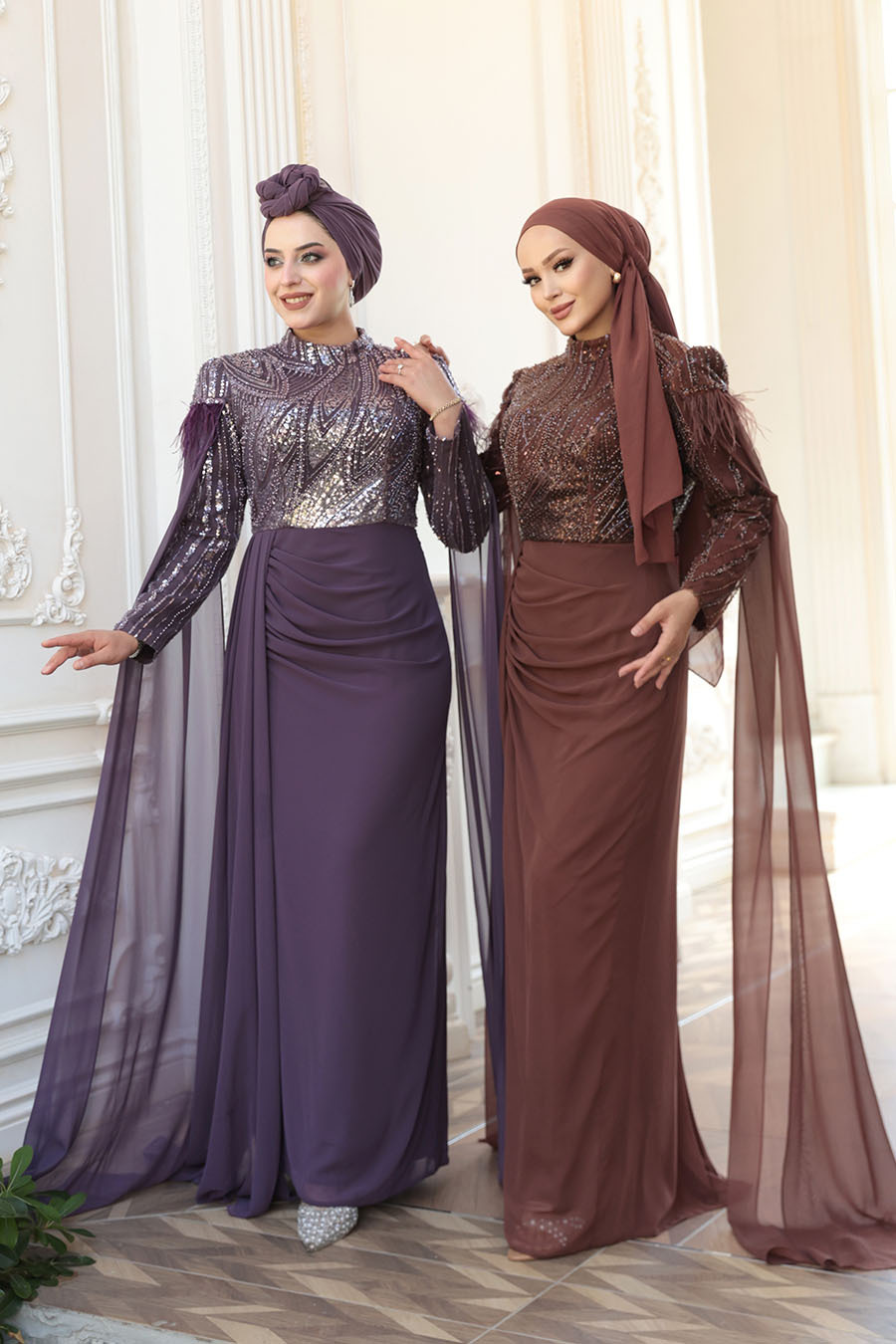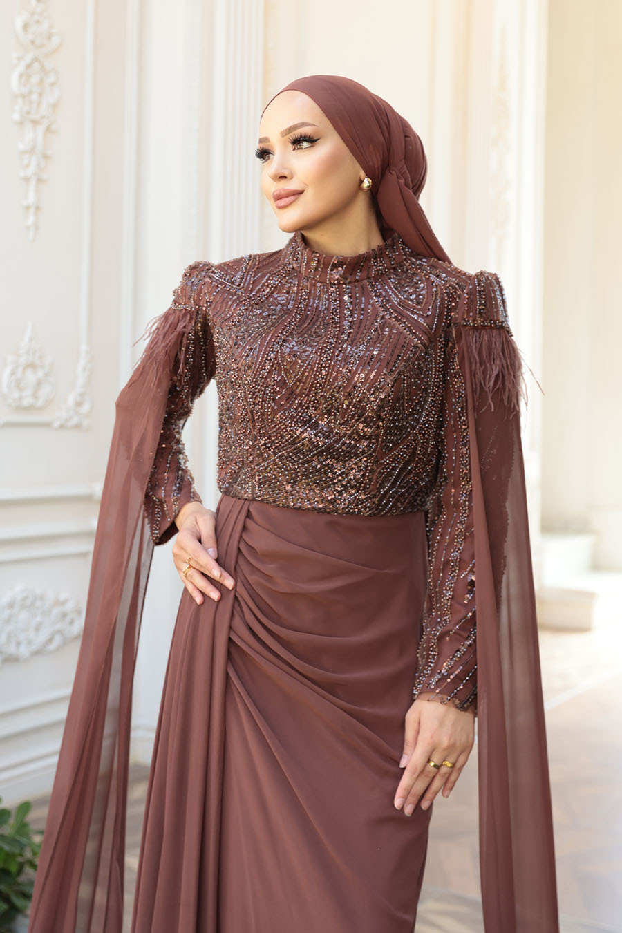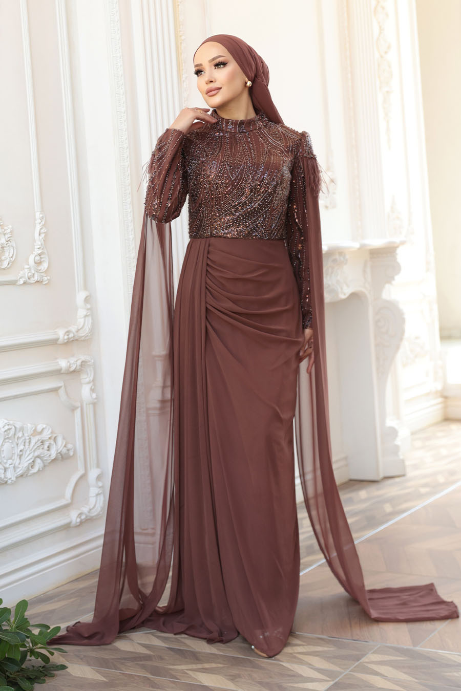 Ürün Özelliği:Dik yaka, uzun kollu, omuzları tüylü, pelerinli, boncuk işlemeli, drape detaylı, astarlı ve arka ortadan fermuarlıdır..