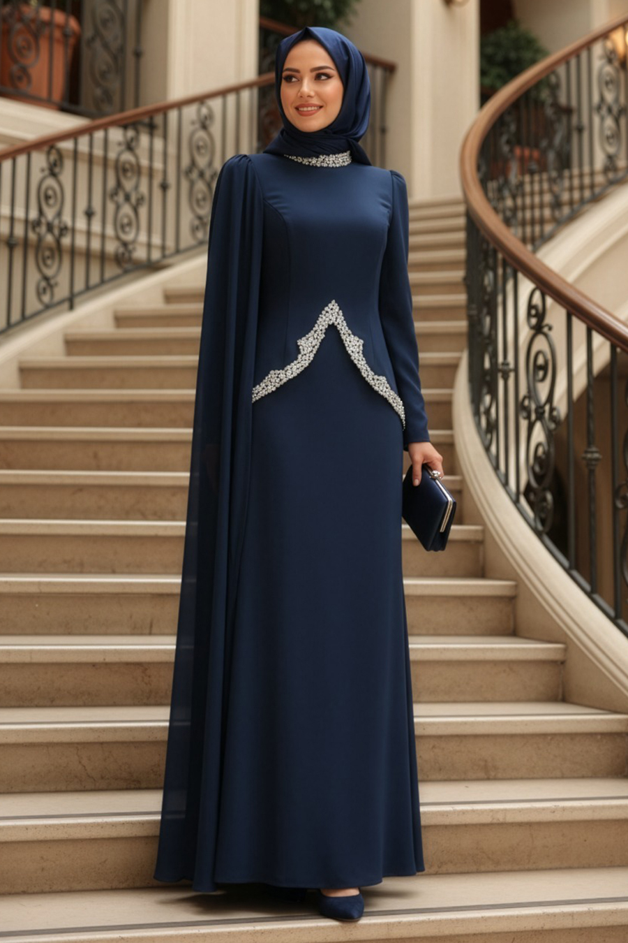 Ürün Özelliği:Sıfır yaka, uzun kollu, boncuk işlemeli, arka ortadan fermuarlı, pelerinli ve omuzları büzgülüdür.