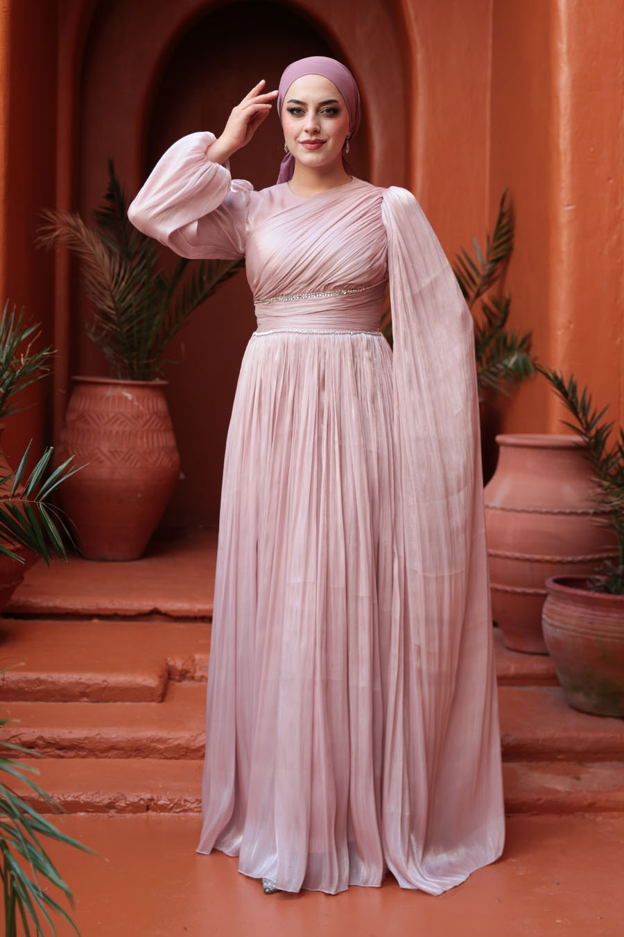 Ürün Özelliği:Sıfır yaka, uzun kollu, kol ucu lastikli, drapeli, boncuk detaylı, omuzları büzgülü, tek omuzu pelerin detaylı, astarlı ve arka ortadan fermuarlıdır.