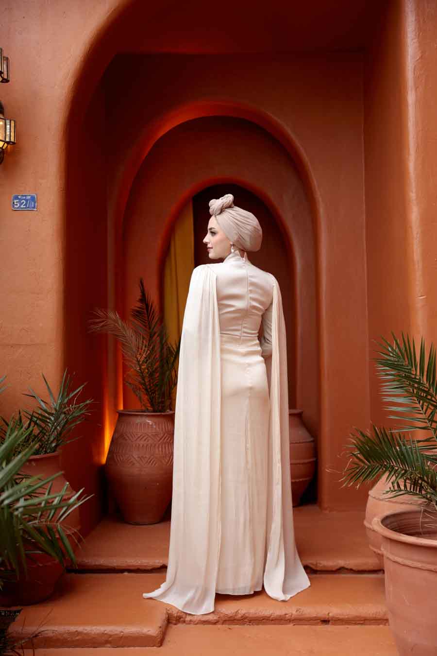 Kumaş Özelliği: Işıltılı kumaştan üretilmiştir.Ürün Özelliği: Dik yaka, uzun kollu, omuzları pelerinli, arka ortadan fermuarlı, astarlı, drape ve boncuk detaylıdır.