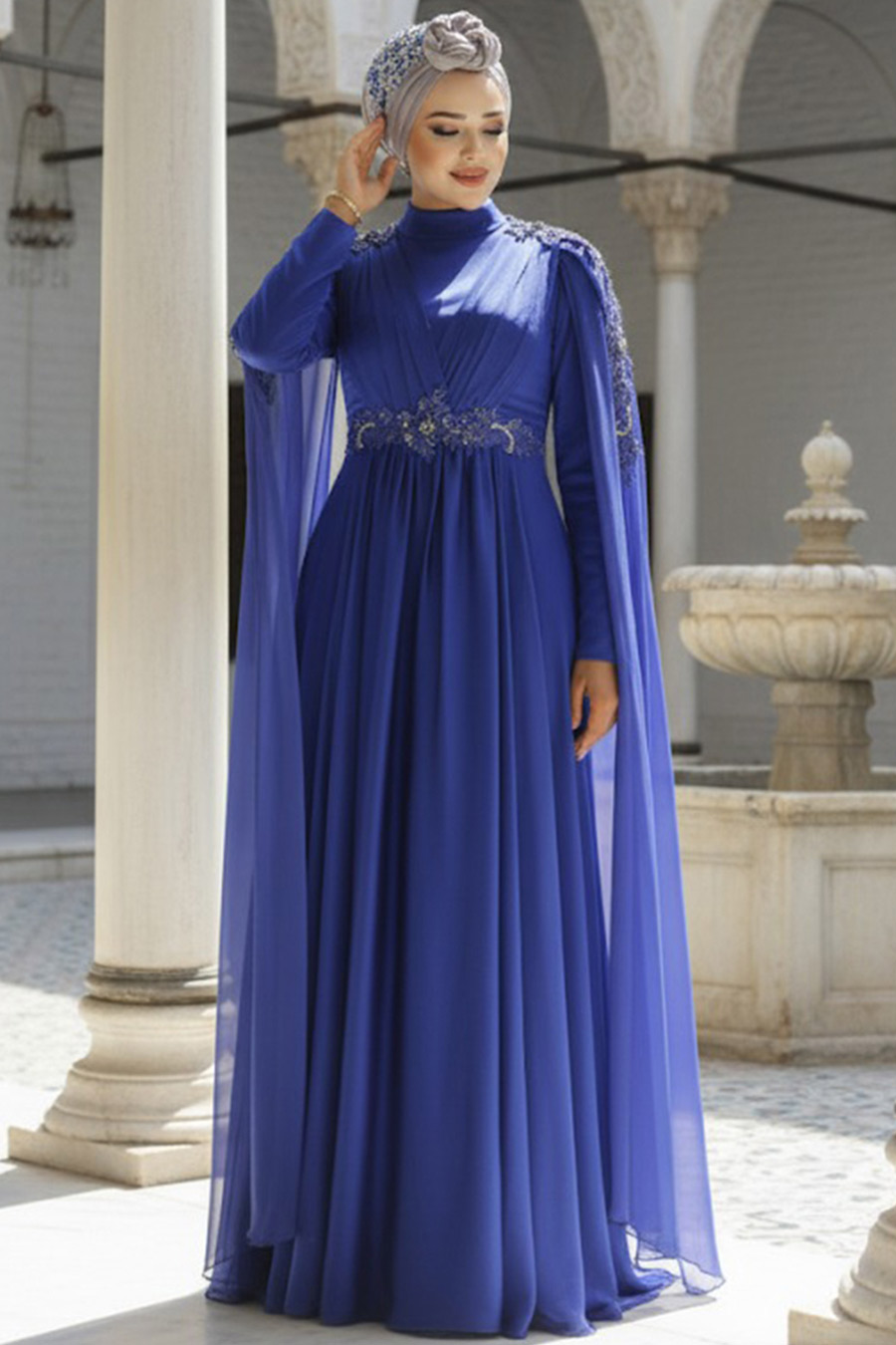 Kumaş Özelliği: %100 Polyester kumaştan üretilmiştir.Ürün Özelliği: Sıfır yaka, uzun kollu, kolları pelerinli, boncuk işleme detaylı, arka ortadan fermuarlı ve astarlıdır.