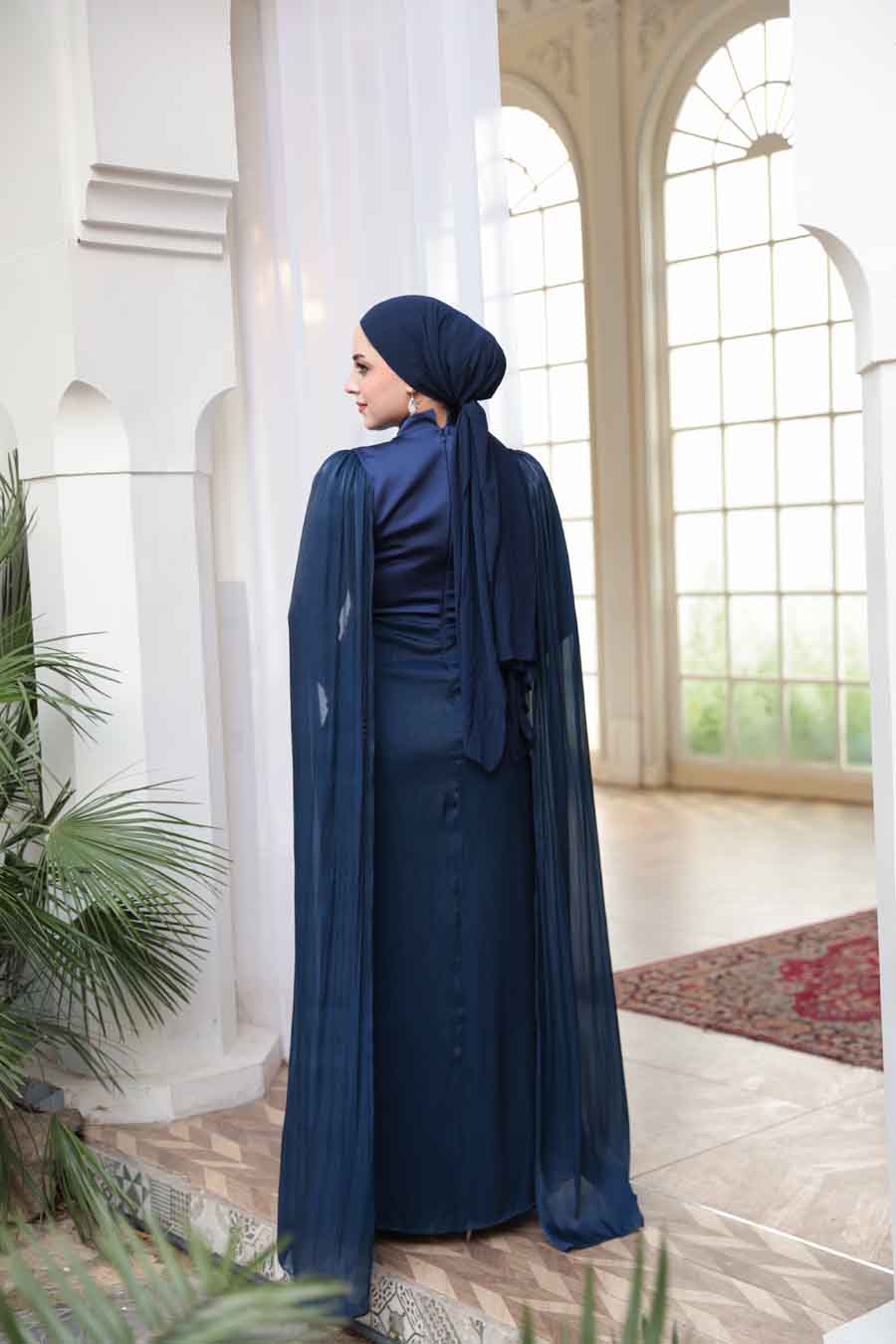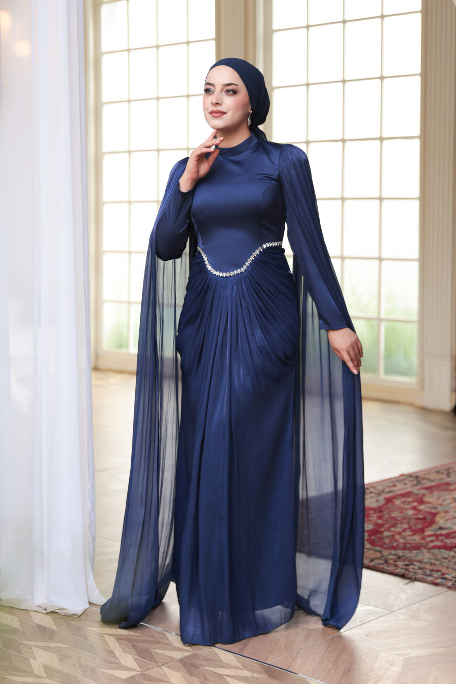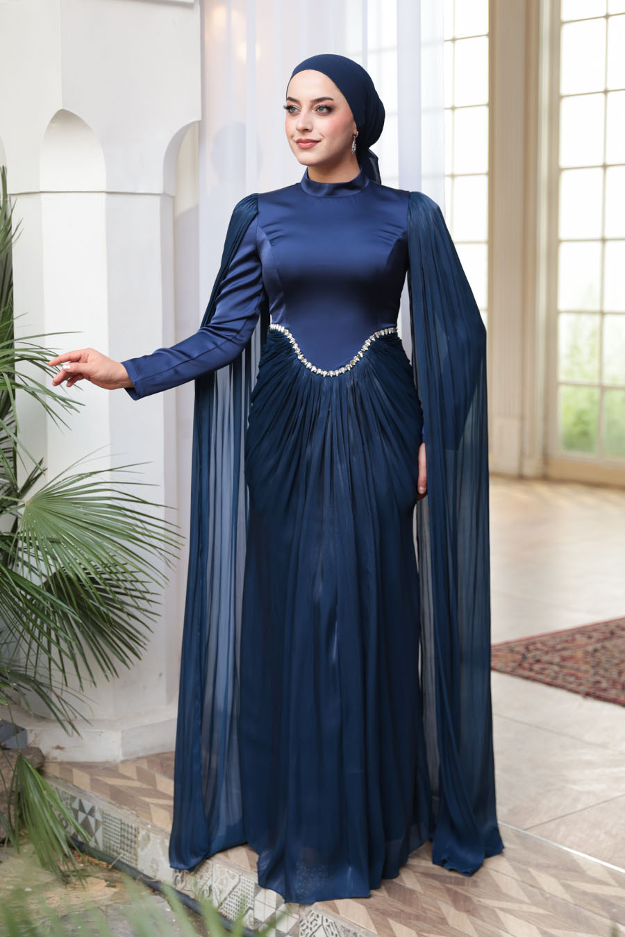 Kumaş Özelliği: Işıltılı ve saten kumaştan üretilmiştir.Ürün Özelliği: Dik yaka, uzun kollu, omuzları pelerinli, arka ortadan fermuarlı, astarlı, drape ve boncuk detaylıdır.