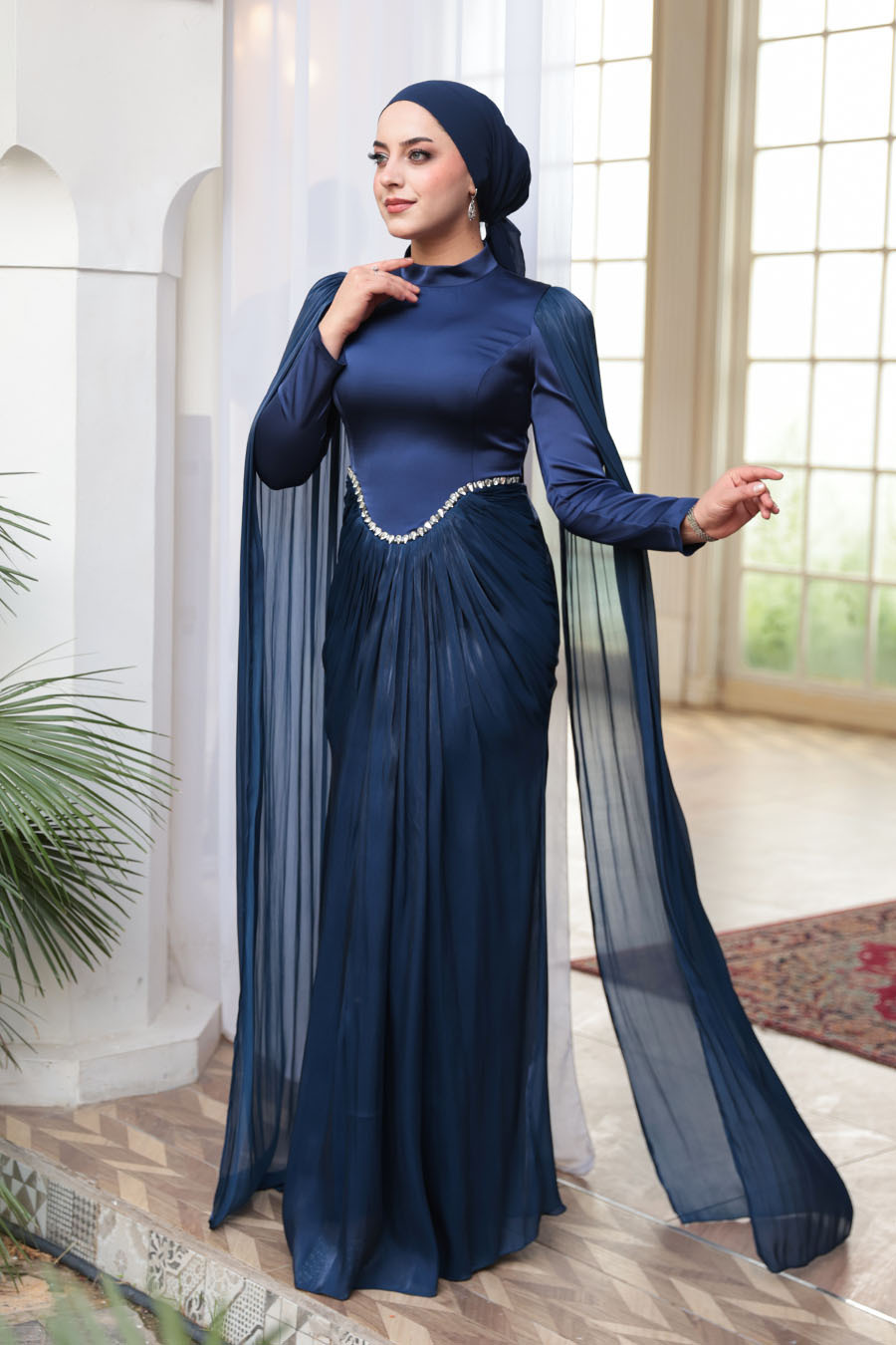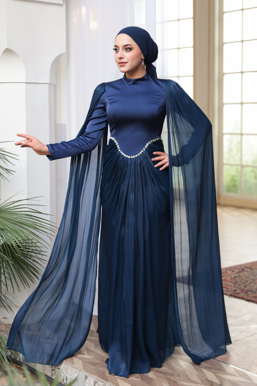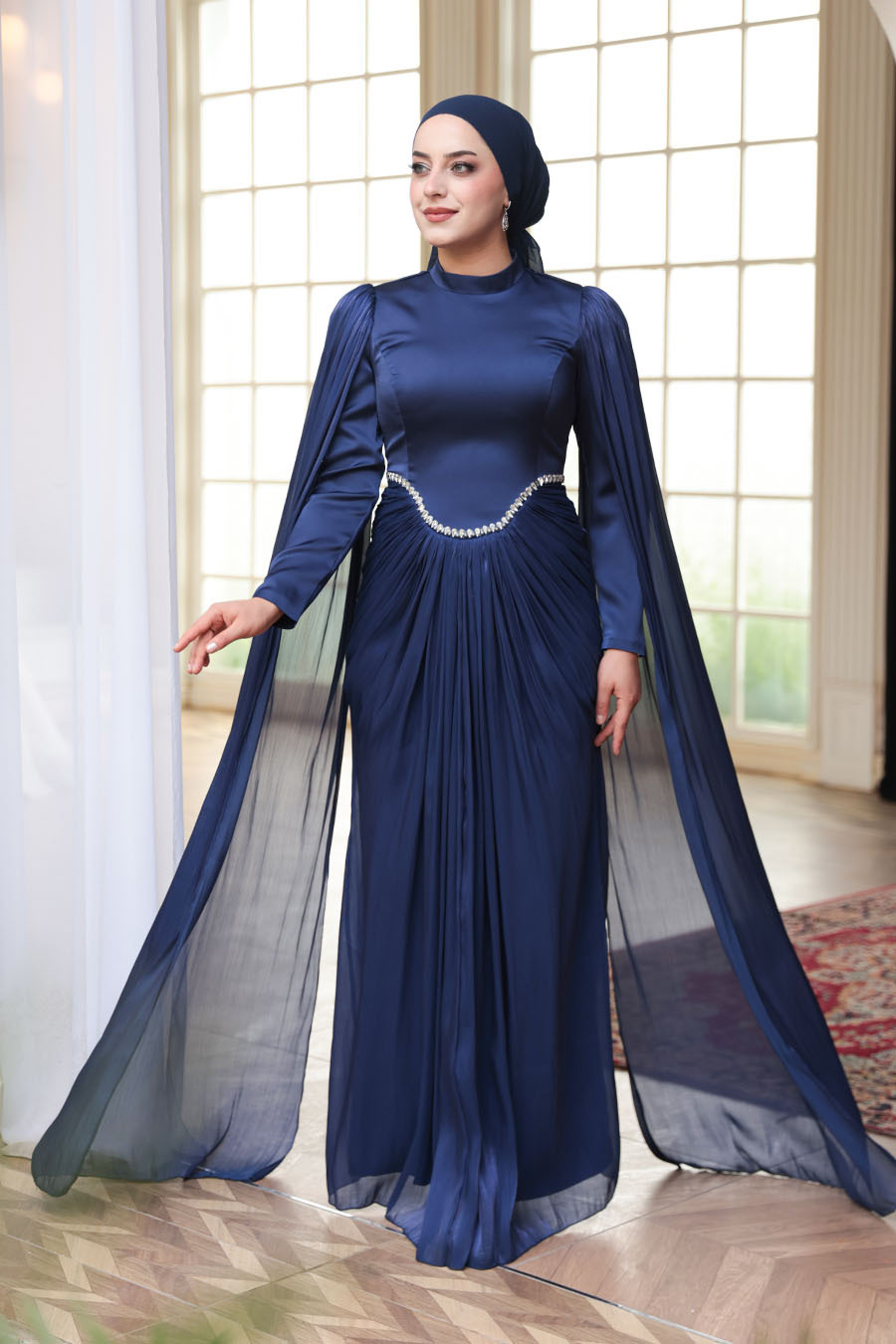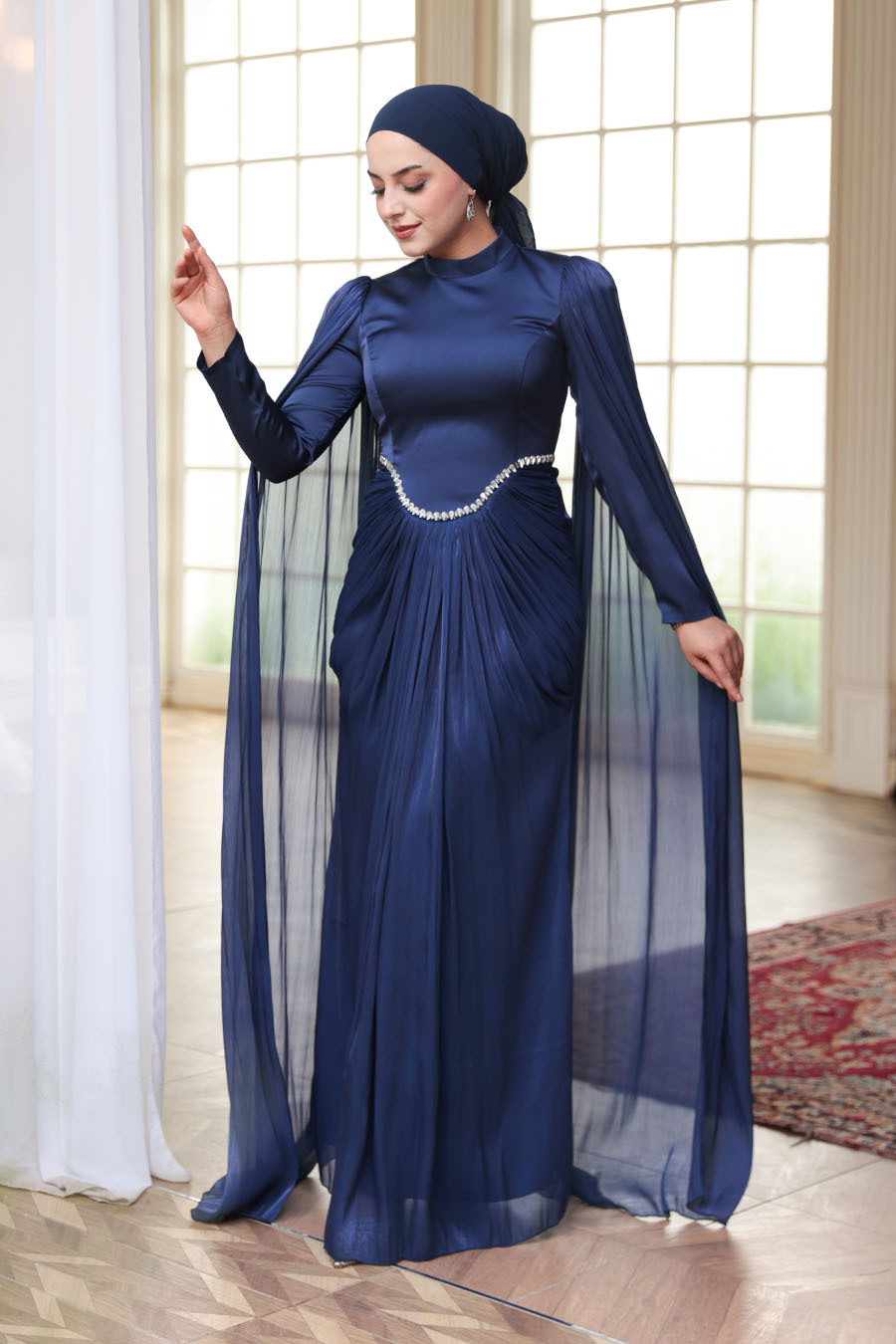 Kumaş Özelliği: Işıltılı ve saten kumaştan üretilmiştir.Ürün Özelliği: Dik yaka, uzun kollu, omuzları pelerinli, arka ortadan fermuarlı, astarlı, drape ve boncuk detaylıdır.