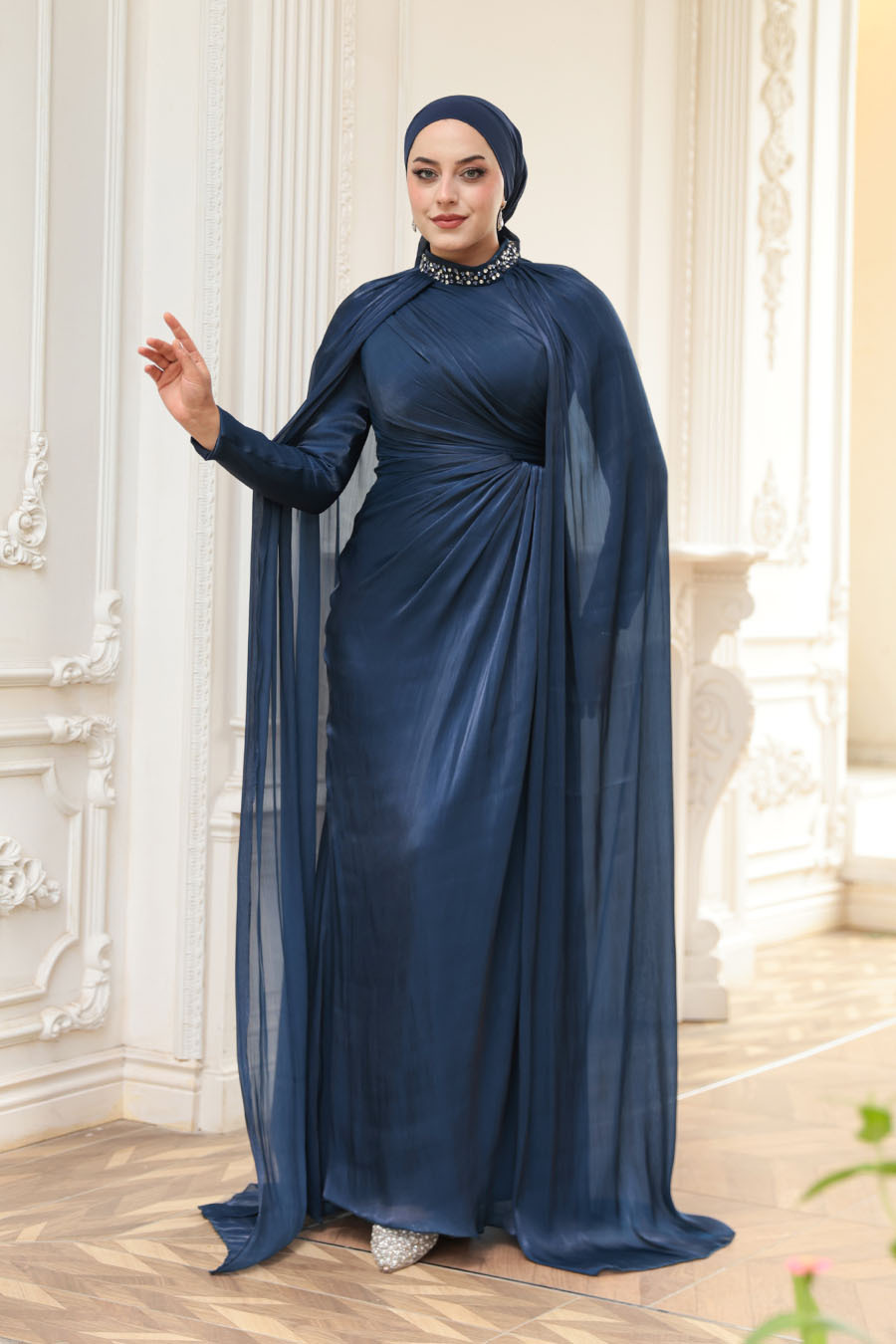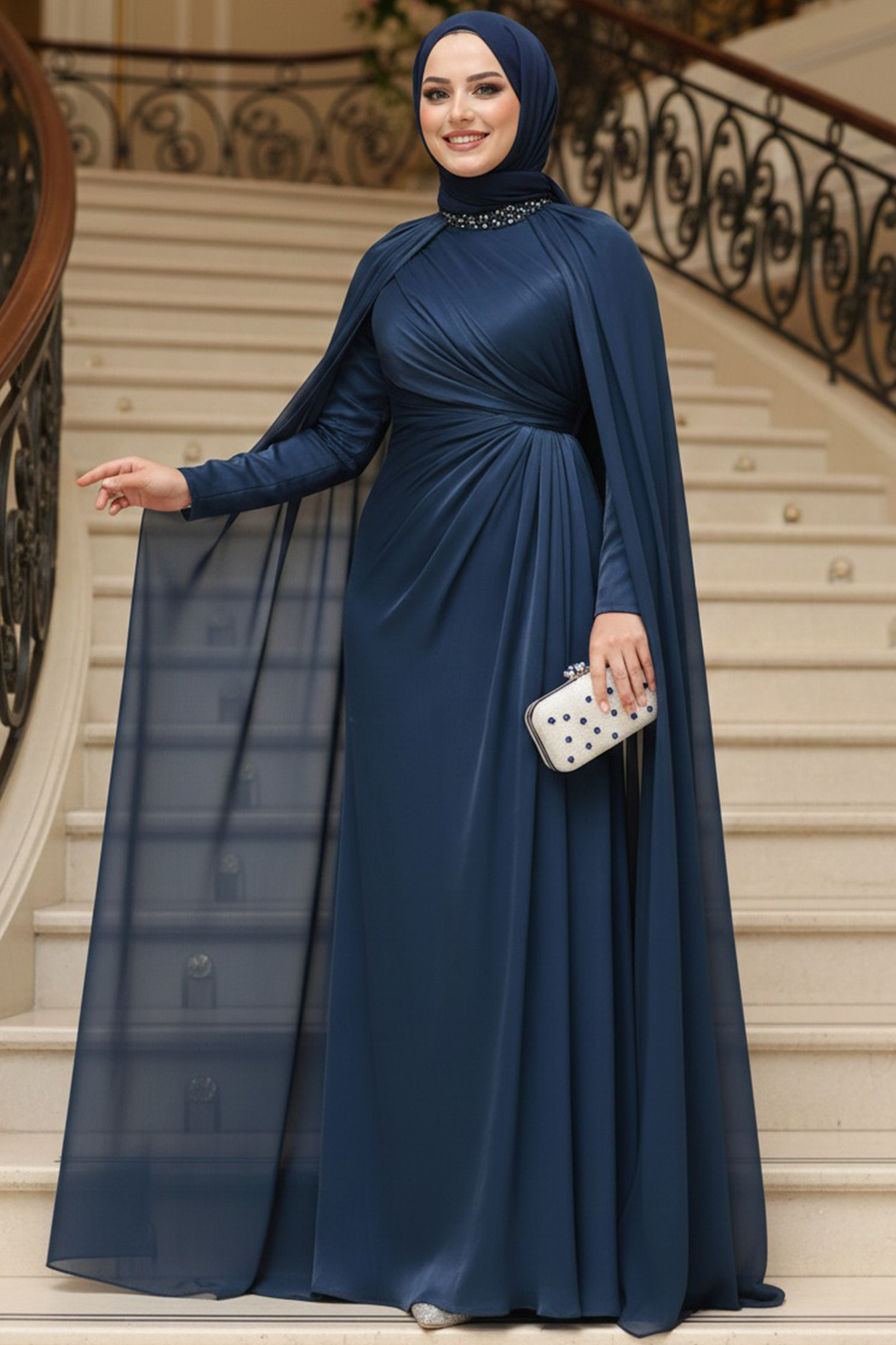 Kumaş Özelliği: Tül kumaştan üretilmiştir.Ürün Özelliği: Dik yaka, uzun kollu, yakası boncuk detaylı, pelerinli, arka ortadan fermuarlı, drape detaylı ve astarlıdır.