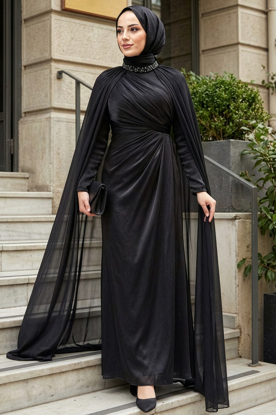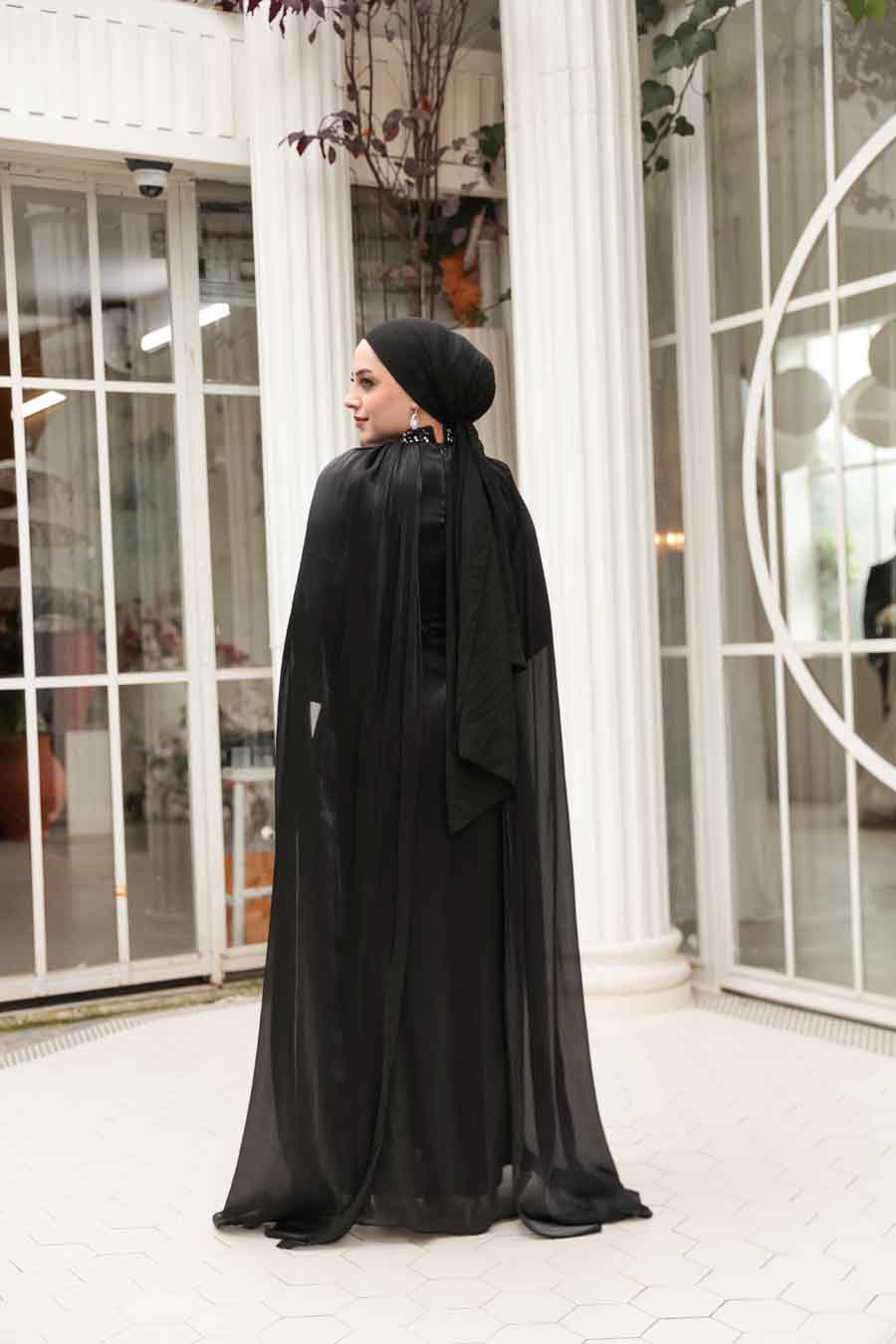 Kumaş Özelliği: Tül kumaştan üretilmiştir.Ürün Özelliği: Dik yaka, uzun kollu, yakası boncuk detaylı, pelerinli, arka ortadan fermuarlı, drape detaylı ve astarlıdır.