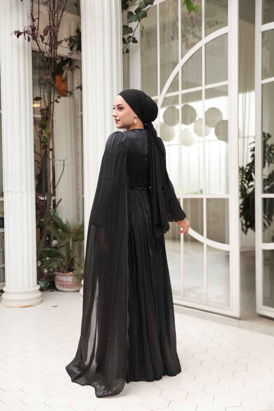 Kumaş Özelliği: Işıltılı kumaştan üretilmiştir.Ürün Özelliği: Sıfır yaka, uzun kollu, manşetli, omuzları pelerinli, drape detaylı, arka ortadan fermuarlı ve astarlıdır.