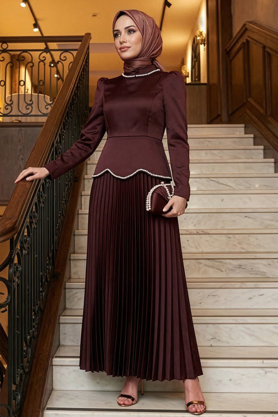 Ürün Özelliği: Dik yaka, uzun kollu, omuzları büzgülü, boncuk detaylı, eteği pileli ve arka ortadan fermuarlıdır.