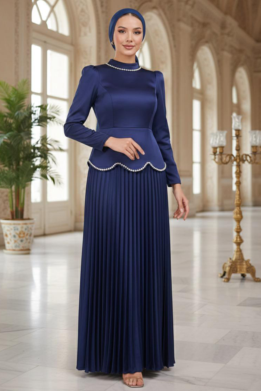 Ürün Özelliği: Dik yaka, uzun kollu, omuzları büzgülü, boncuk detaylı, eteği pileli ve arka ortadan fermuarlıdır.