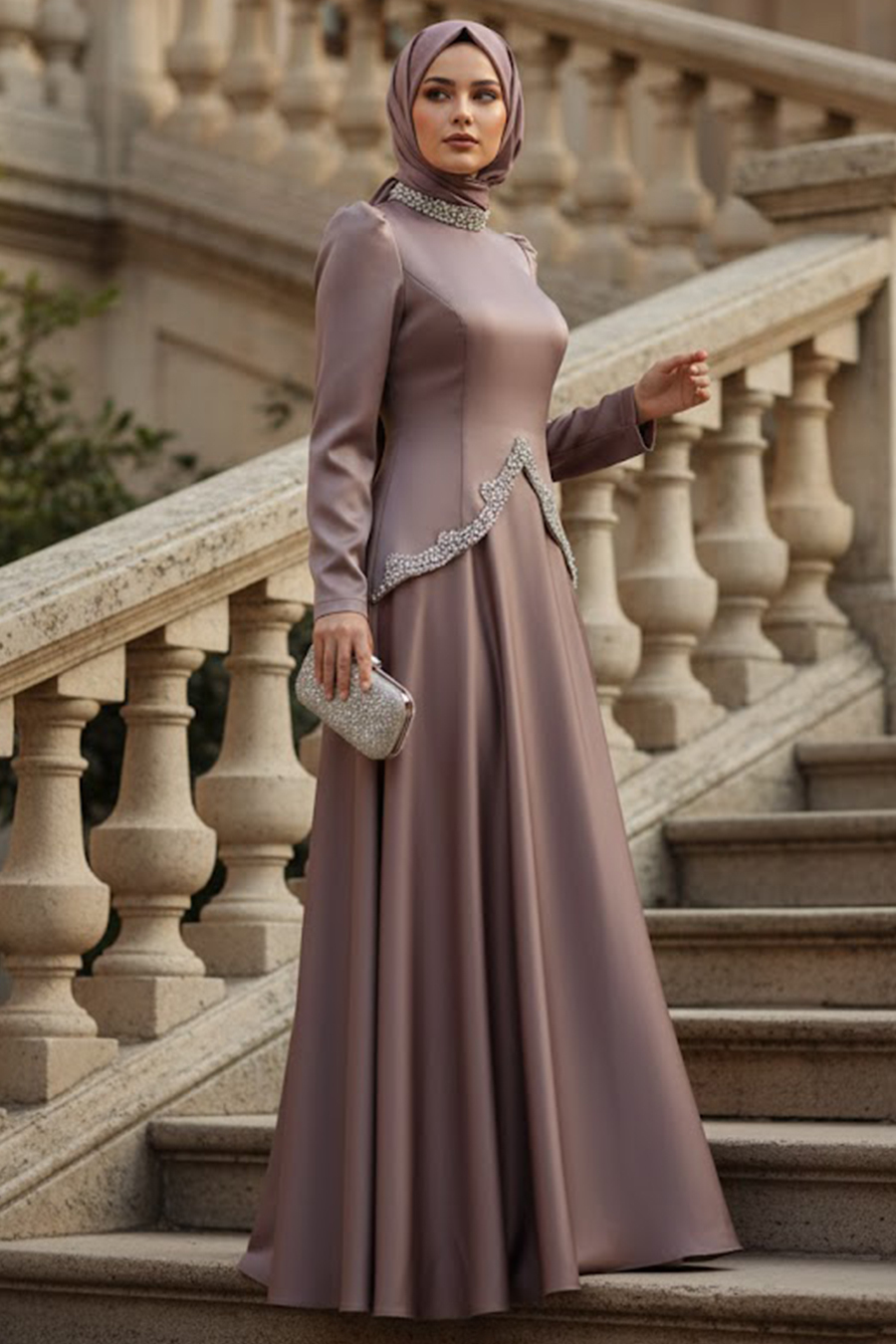 Ürün standart kalıp olup normalde kullandığınız bedeni sipariş vermeniz tavsiye olunur. Özel günler, düğün, nişan, söz, davet ve mezuniyet için aradığınız tesettürlü abiye elbisedir.