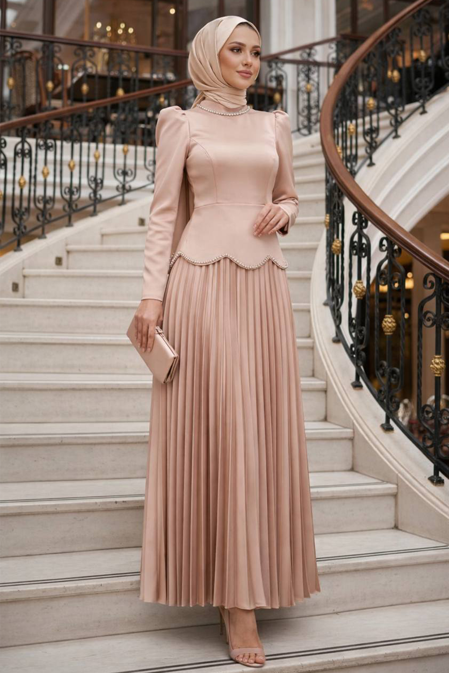 Ürün Özelliği: Dik yaka, uzun kollu, omuzları büzgülü, boncuk detaylı, eteği pileli ve arka ortadan fermuarlıdır.