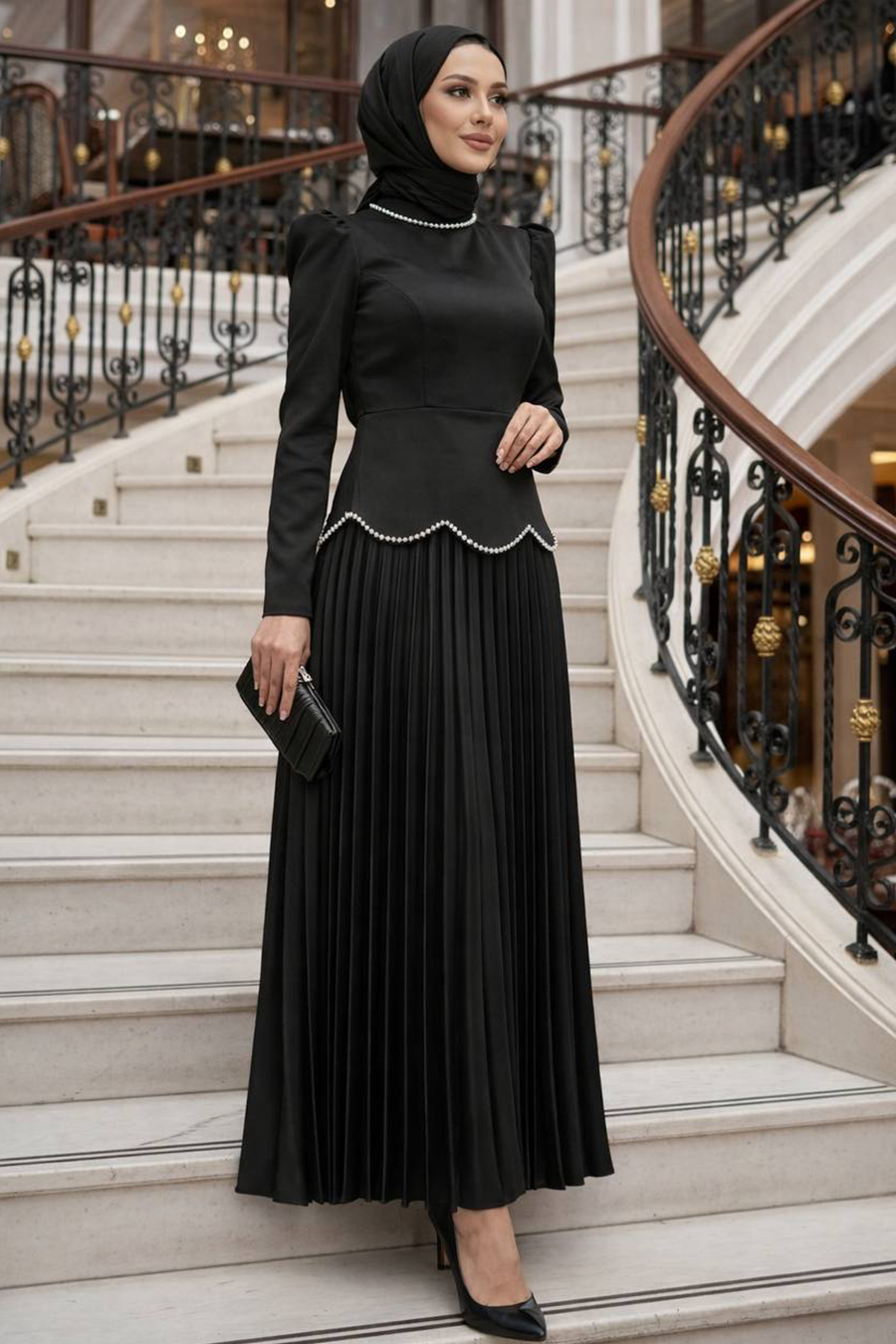 Ürün Özelliği: Dik yaka, uzun kollu, omuzları büzgülü, boncuk detaylı, eteği pileli ve arka ortadan fermuarlıdır.
