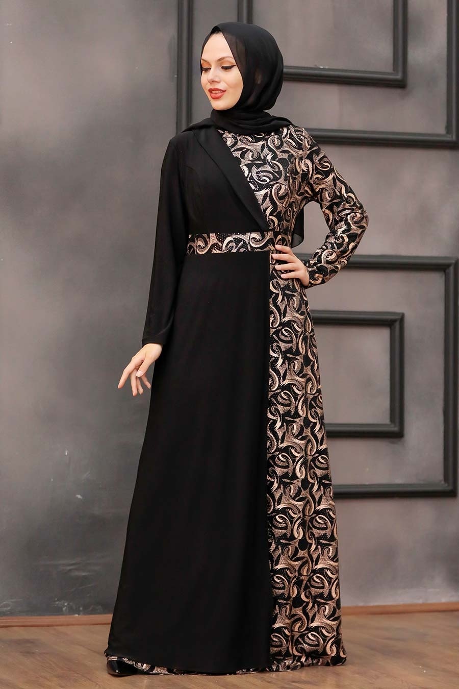 Tesettürlü Abiye Elbise - Payet Boncuk İşlemeli Siyah Tesettür Abiye Elbise 47963S