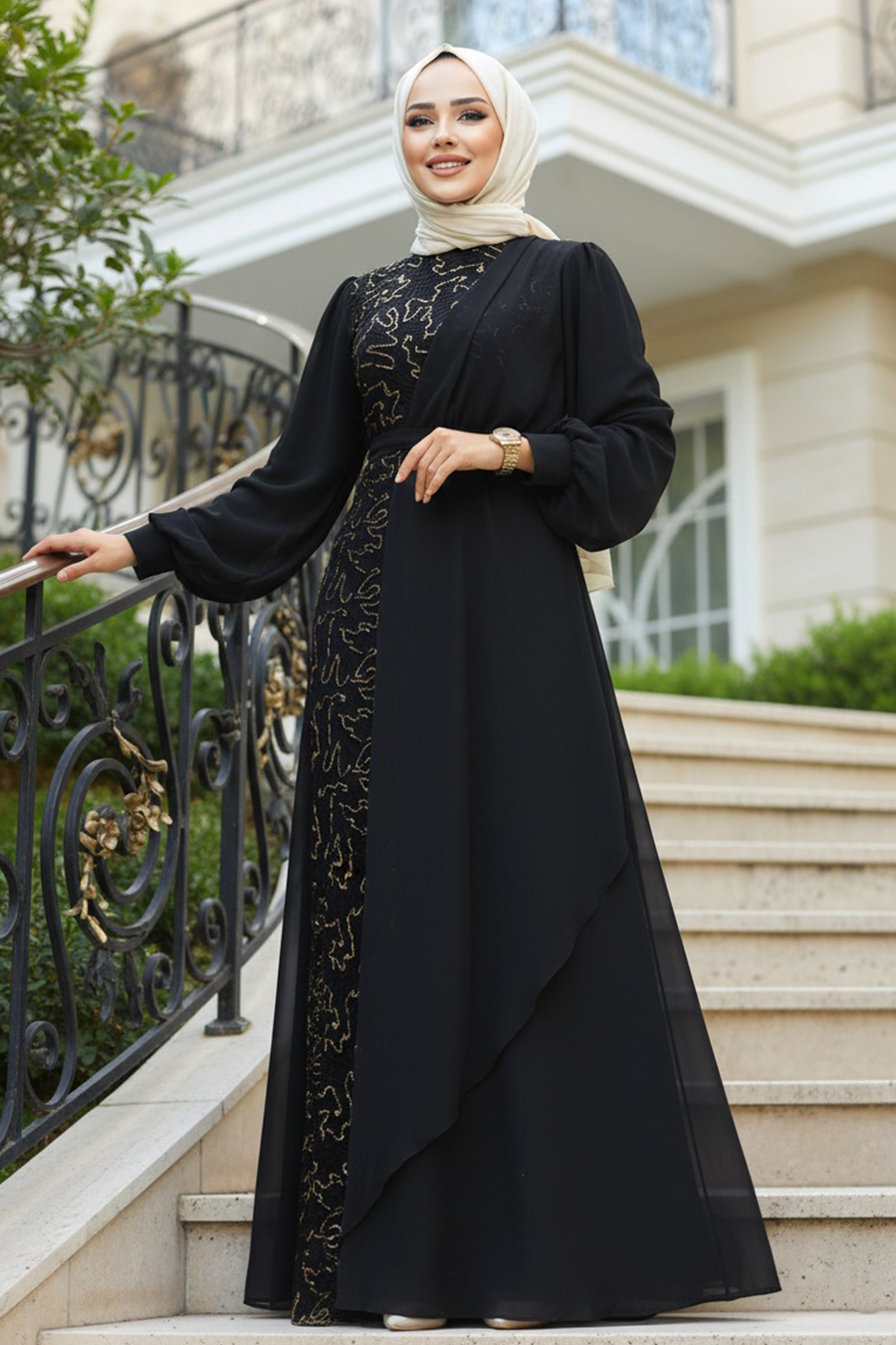 Ürün Özelliği:Sıfır yaka, uzun kollu, manşetli, pul payet işlemeli, şifon detaylı, arka ortadan fermuarlı ve astarlıdır.