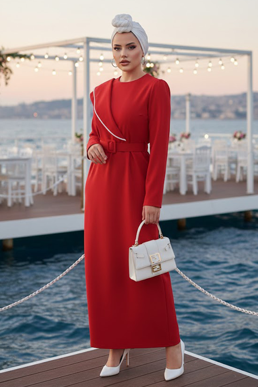 Ürün Özelliği: Sıfır yaka, uzun kollu, omuzları büzgülü, tokalı kemerli, tek omuz işlemeli drapeli ve arka ortadan fermuarlıdır.