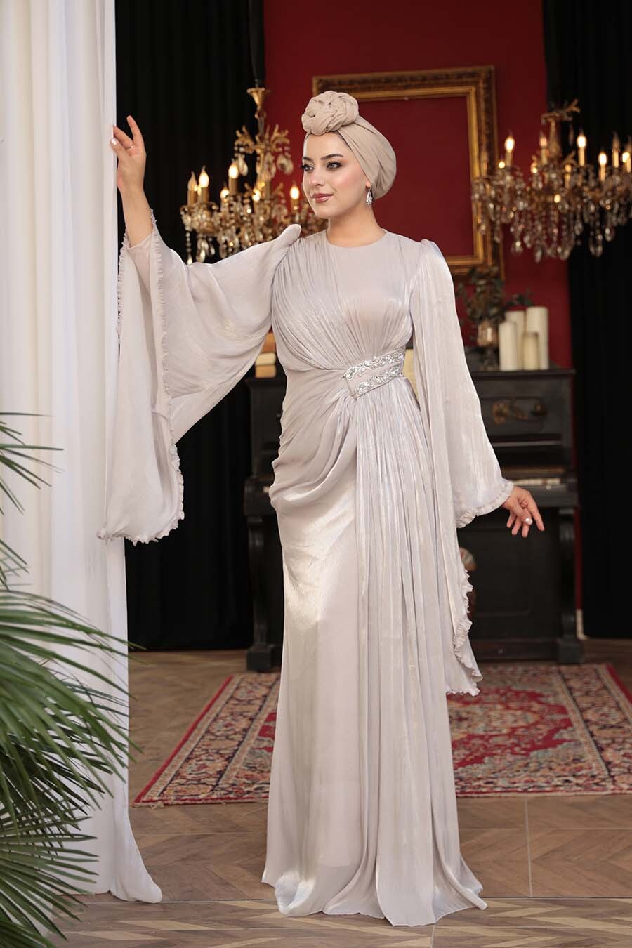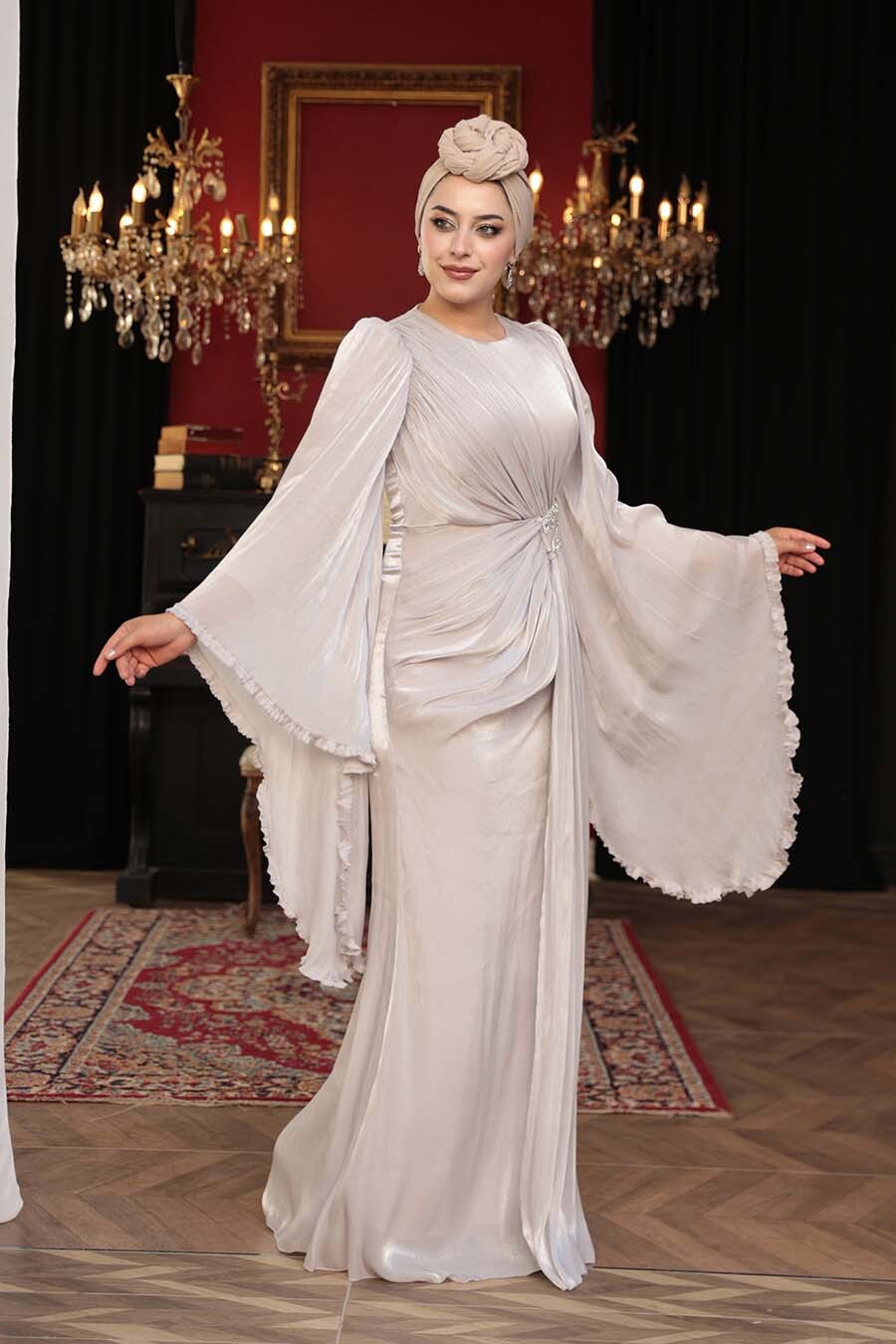 Ürün standart kalıp olup normalde kullandığınız bedeni sipariş vermeniz tavsiye olunur. Özel günler, düğün, nişan, söz, davet ve mezuniyet için aradığınız tesettürlü abiye elbisedir.