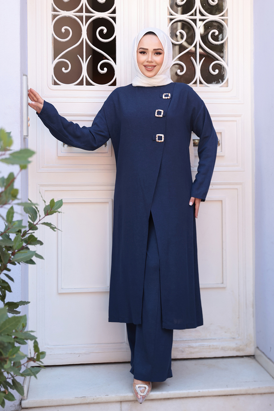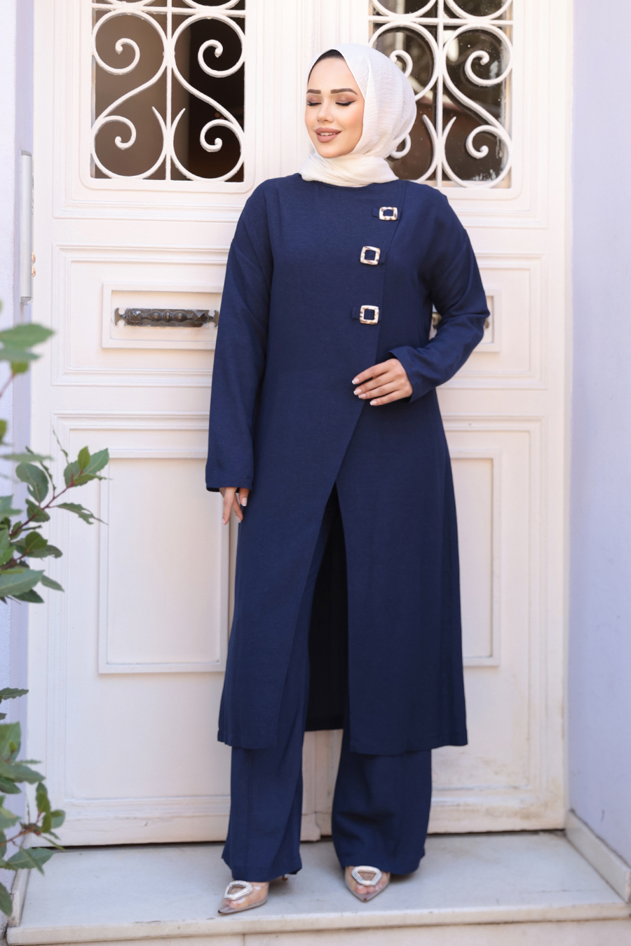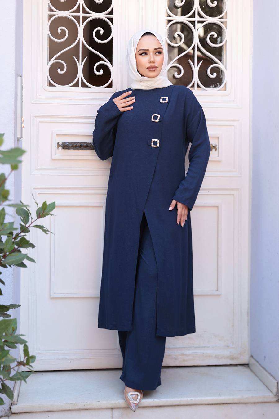Ürün Özelliği: Sıfır yaka, uzun kollu, toka detaylı, asimetrik kesim yırtmaçlı, pantolon belden lastikli ve boru paçadır. Ürün Boyu:Üst:123 cm Alt:112 cm