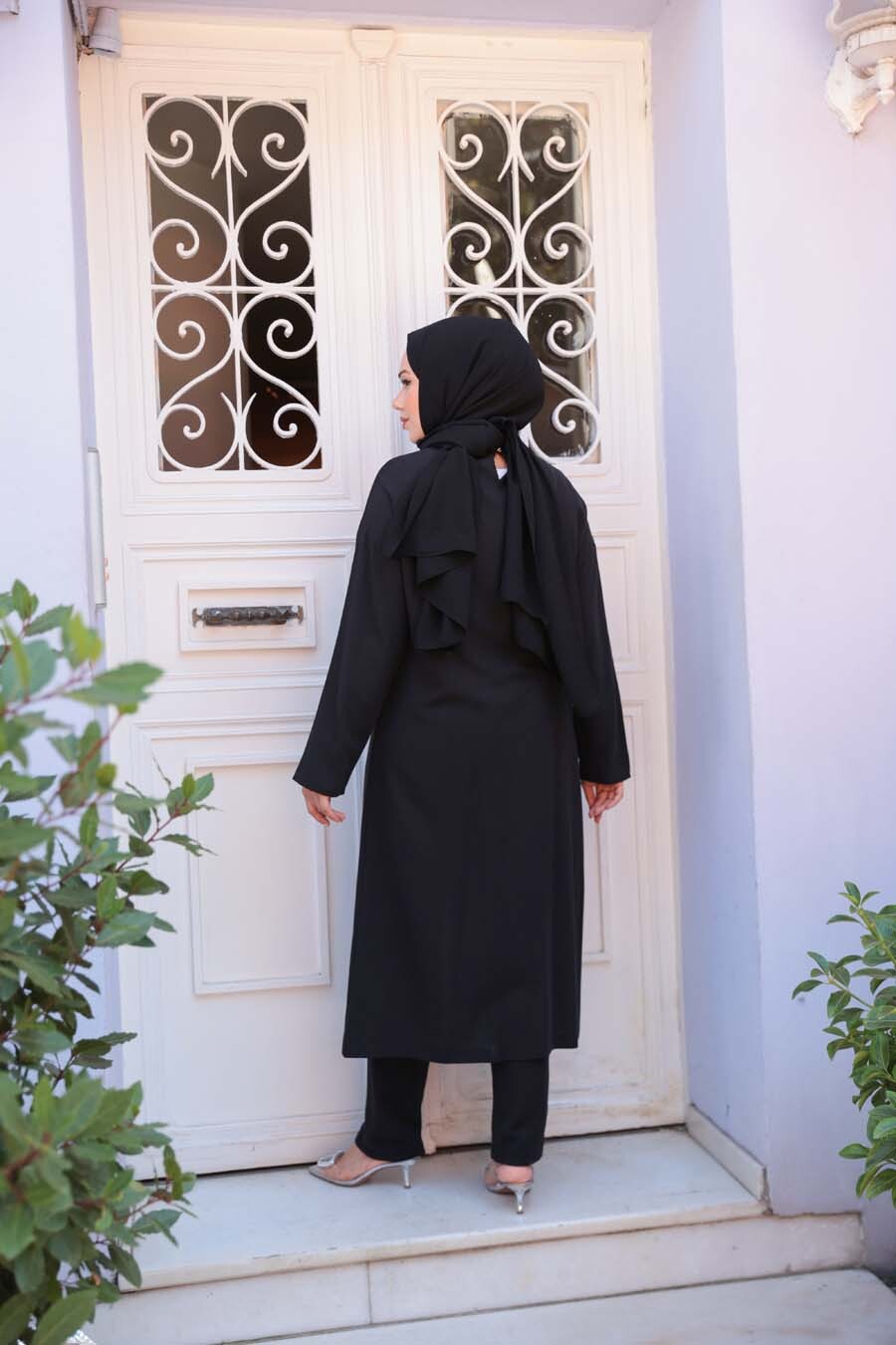 Ürün Özelliği: Sıfır yaka, uzun kollu, toka detaylı, asimetrik kesim yırtmaçlı, pantolon belden lastikli ve boru paçadır. Ürün Boyu:Üst:123 cm Alt:112 cm