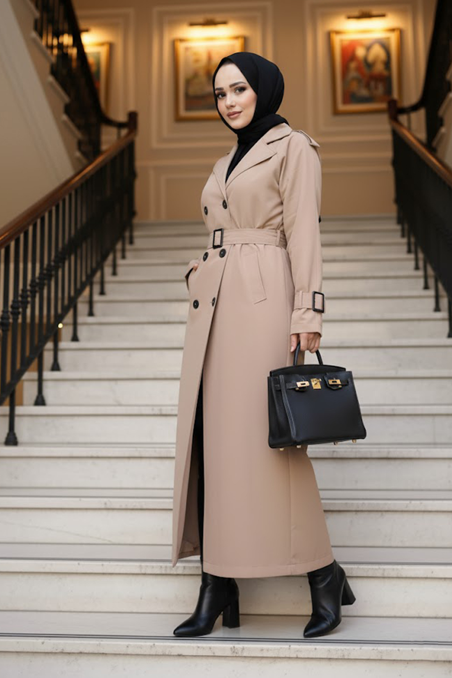 Kemerli Siyah Tesettür Trençkot 60500S