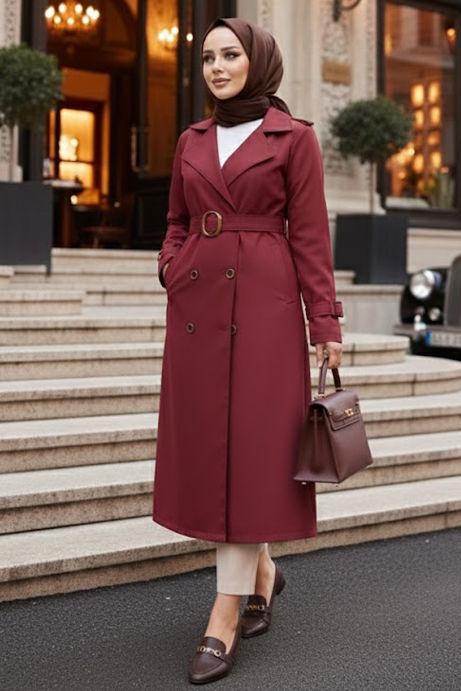Tokalı Kemerli Bordo Tesettür Trençkot 5942BR