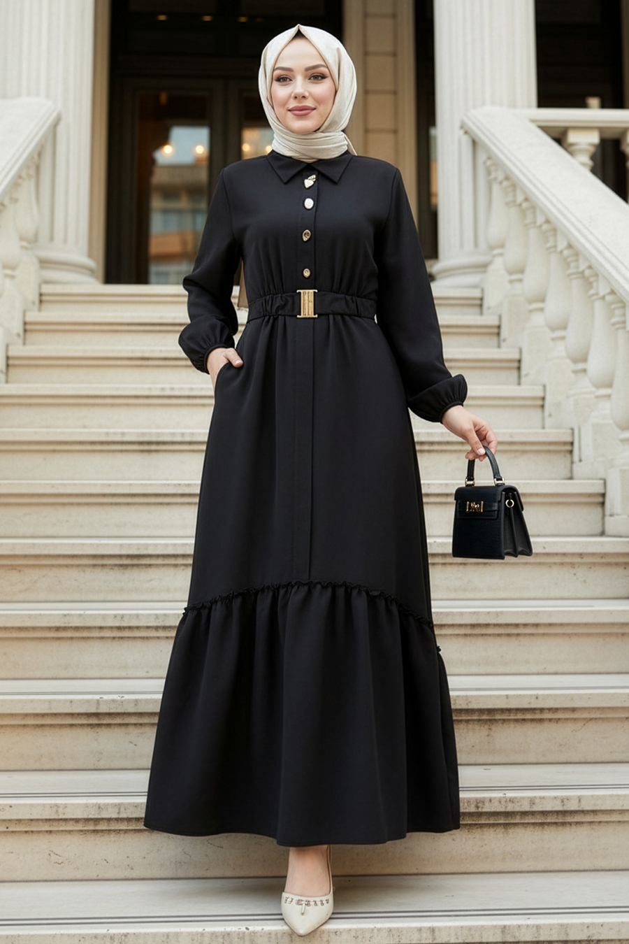 Ürün Özelliği: Klasik yaka, uzun kollu, kol ucu lastikli, ön ortadan düğmeli, etek ucu volanlı ve tokalı kemerlidir.