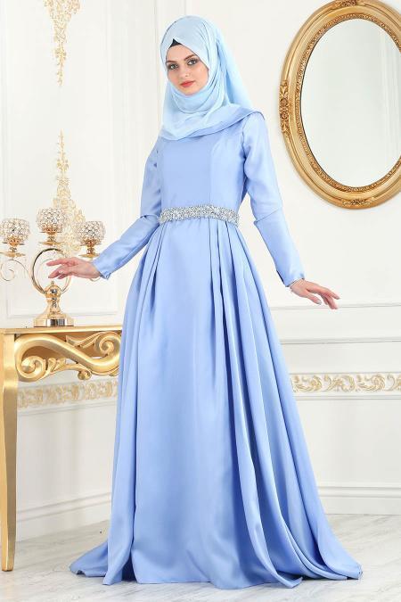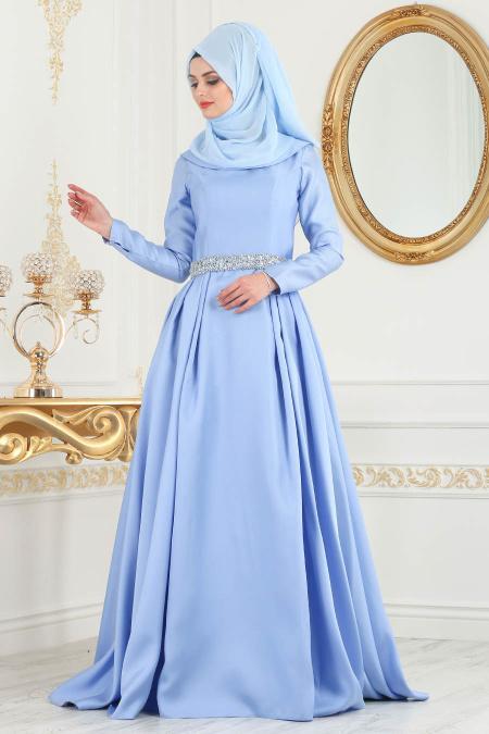 Tuay - Beli Taşlı Bebek Mavisi Tesettür Abiye Elbise 2363BM