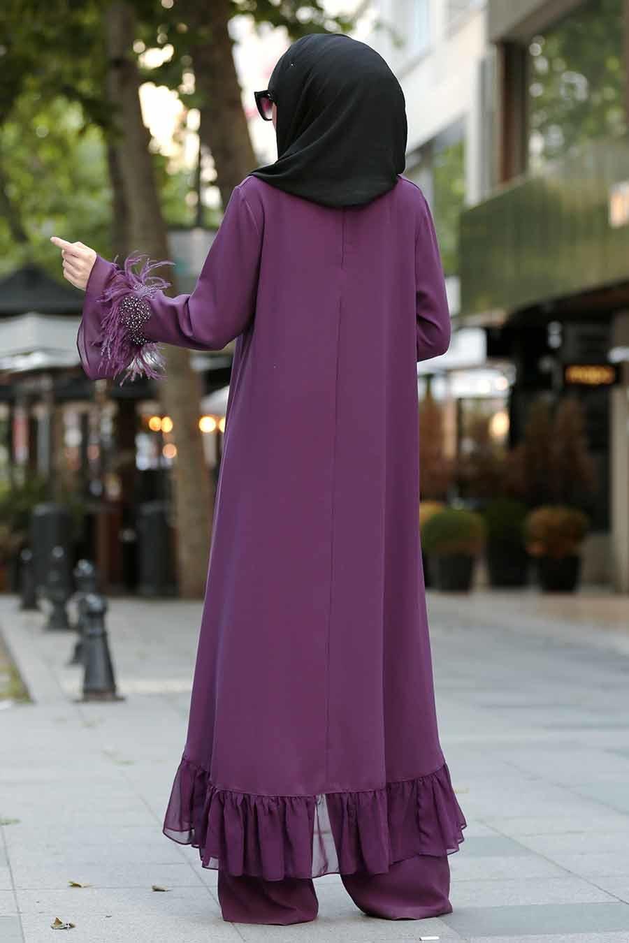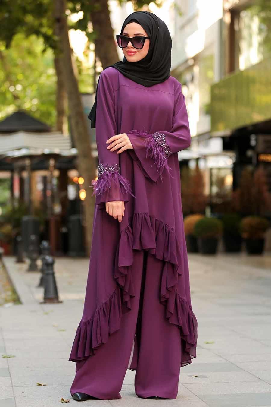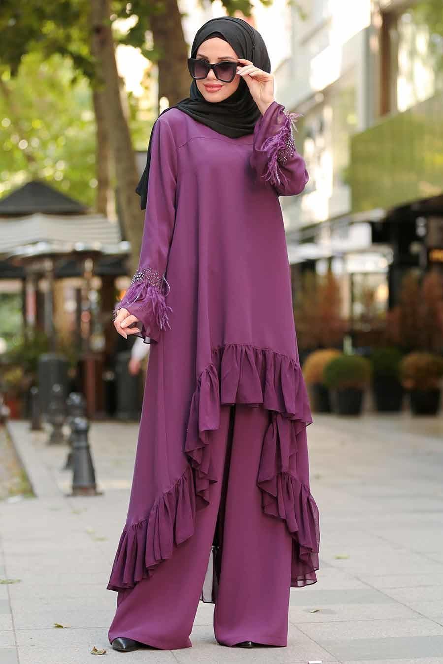 Kumaş Özelliği: Krep kumaştan üretilmiştir.Ürün Özelliği: Ürün ikili takımdır. Pantolon önden fermuarlı belden lastiklidir. Tunik arka ortadan fermuarlıdır. Taş ve otriş tül kullanılmıştır. Etek ucu fırfırlıdır.