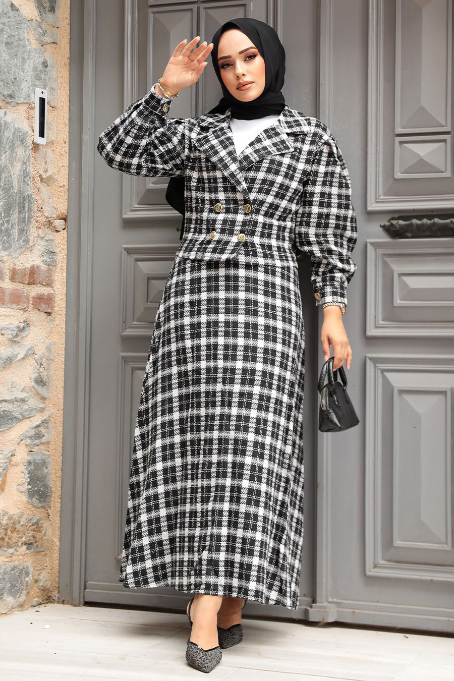 Ürün Özelliği: Klasik yaka, uzun kollu, manşetli, kareli, düğme kapamalı ve eteği kloş kesimdir.Ürün Boyu: Üst:60 cm Elbise:106 cm