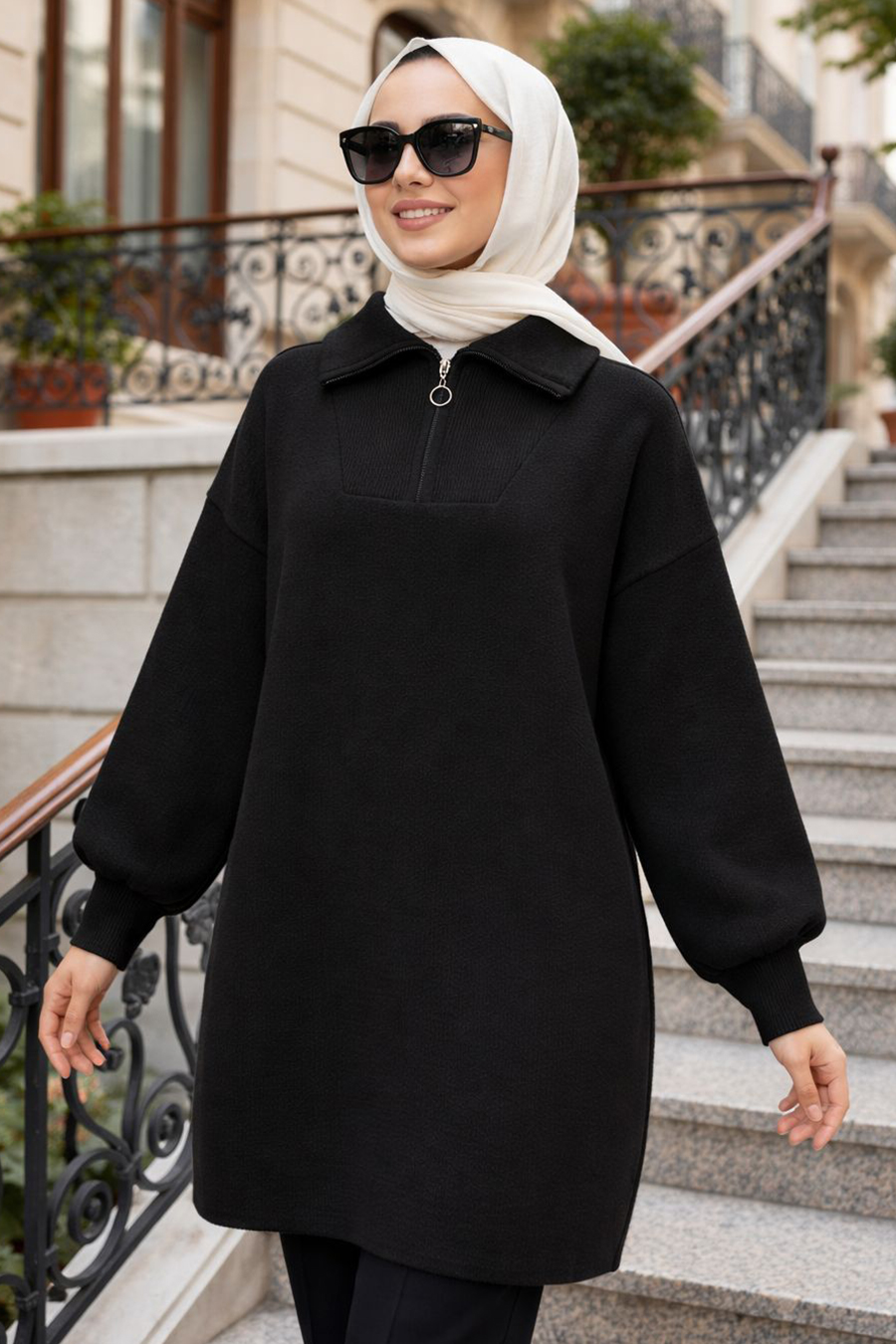 Kumaş Özelliği: Triko kumaştan üretilmiştir.Ürün Özelliği: Boğazlı yaka, yakası fermuarlı, uzun kollu ve kol ucu lastiklidir.