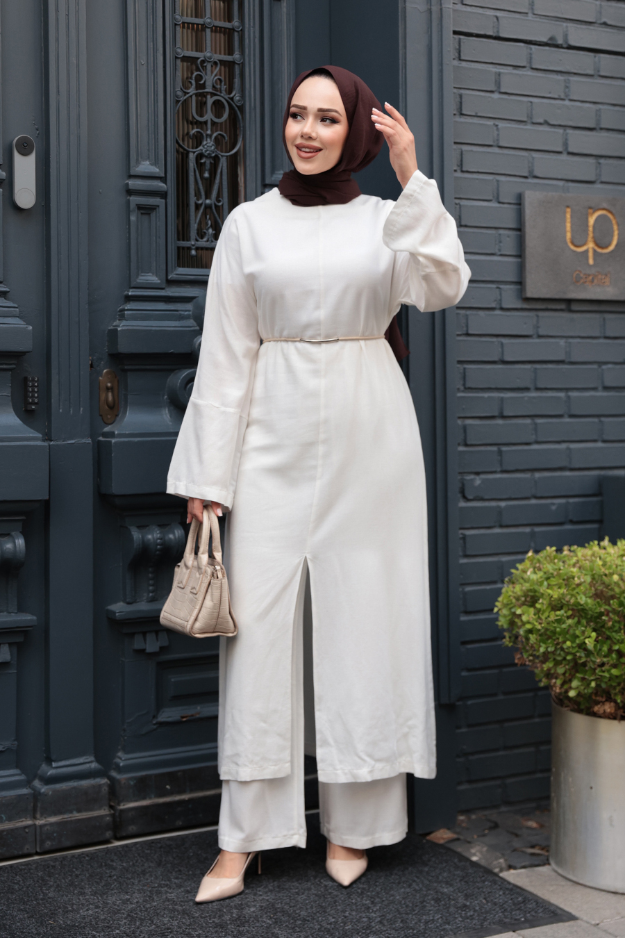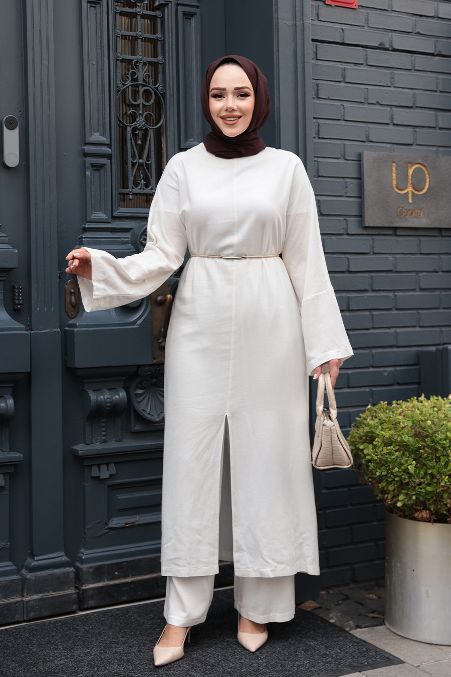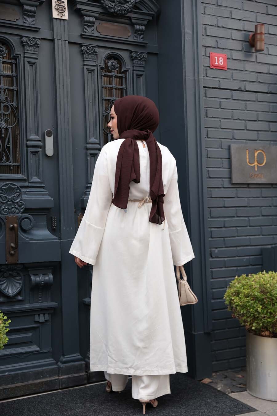 Ürün Özelliği: Sıfır yaka, uzun kollu, ip kemerli, ön ortadan yırtmaçlı, pantolon belden lastikli ve geniş paçadır. Ürün Boyu:Üst:130 cm Alt:105 cm